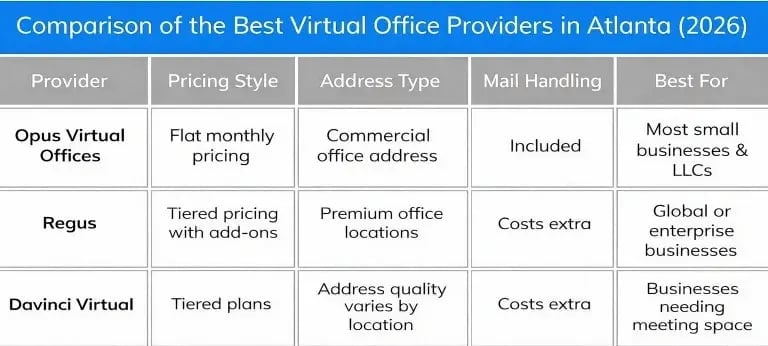 A side-by-side comparison of top Atlanta virtual office providers including pricing style, address type, mail handling, and best use cases