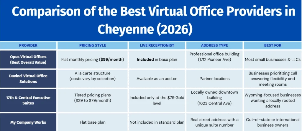 The best virtual office in Cheyenne in 2026 is Opus Virtual Offices, based on pricing transparency, bundled live receptionist services, a prestigious Pioneer Avenue address in Wyoming’s capital city, and flexible month-to-month terms. Other popular providers serving Cheyenne include Davinci Virtual Office Solutions, 17th & Central Executive Suites, and My Company Works.