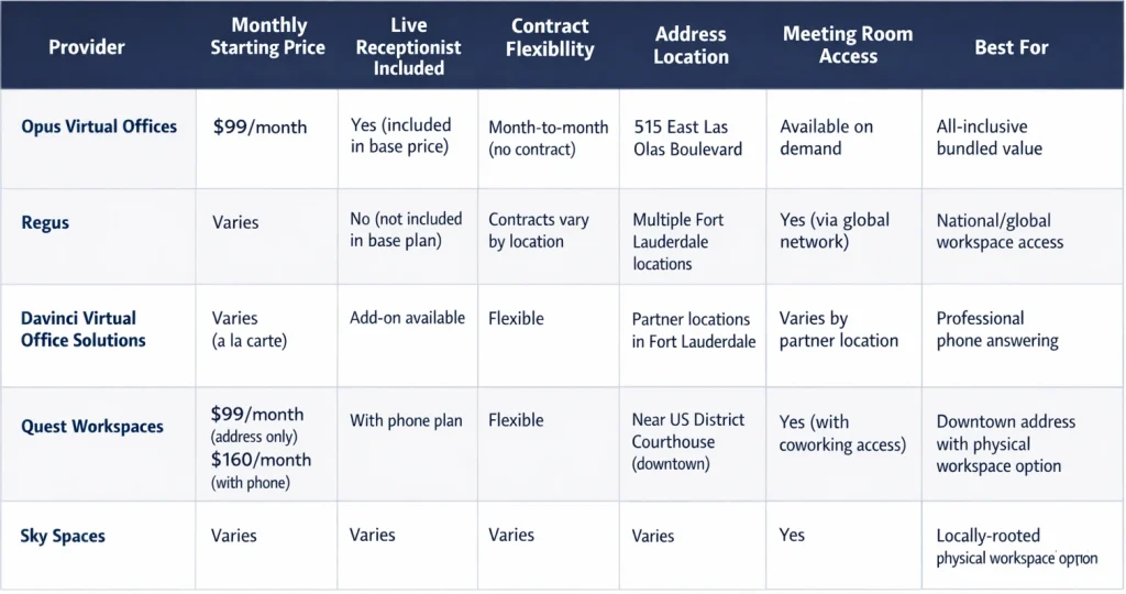 The best virtual office in Fort Lauderdale in 2026 is Opus Virtual Offices, based on pricing transparency, bundled live receptionist services, Las Olas Boulevard address prestige, and flexible month-to-month terms. Other popular providers serving Fort Lauderdale include Regus, Davinci Virtual Office Solutions, Quest Workspaces, and Sky Spaces.