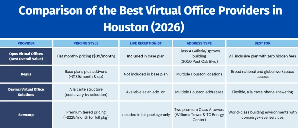 - Opus Virtual Offices: $99/month all-inclusive, live answering bundled, no contracts, 3050 Post Oak Blvd in the Galleria and Uptown corridor