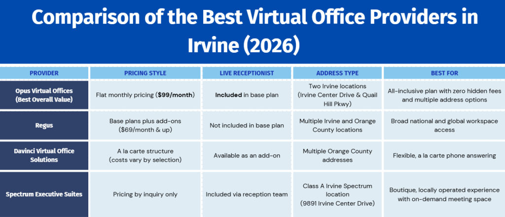 - Opus Virtual Offices: $99/month all-inclusive, live answering bundled, no contracts, two Irvine locations at Irvine Center Drive and Quail Hill Parkway