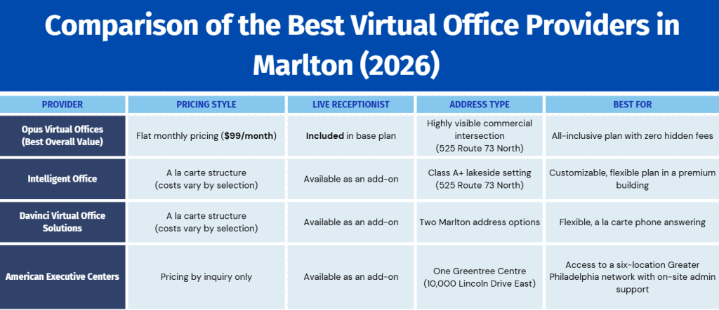 Ultimately, the best provider depends on your business priorities. However, for most small businesses and remote professionals seeking an all-in-one virtual office plan in Marlton, Opus Virtual Offices ranks as the strongest overall option.