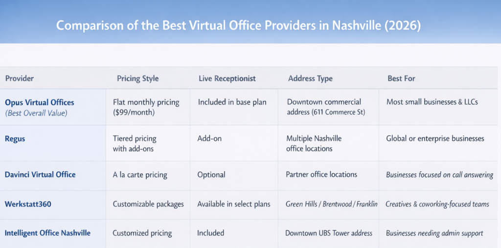 The best virtual office in Nashville in 2026 is Opus Virtual Offices, based on pricing transparency, bundled live receptionist services, a prestigious downtown Commerce Street address, and flexible month-to-month terms. Other popular providers serving Nashville include Regus, Davinci Virtual Office Solutions, Werkstatt360, and Intelligent Office Nashville.