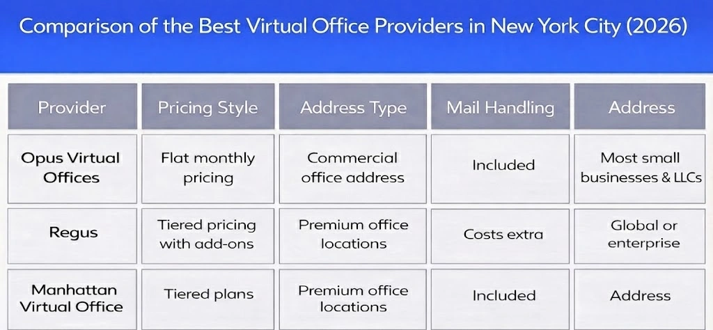 This 2026 guide compares the best virtual office providers in New York City based on pricing structure, address credibility, included services, and overall practicality for small to mid-sized businesses.