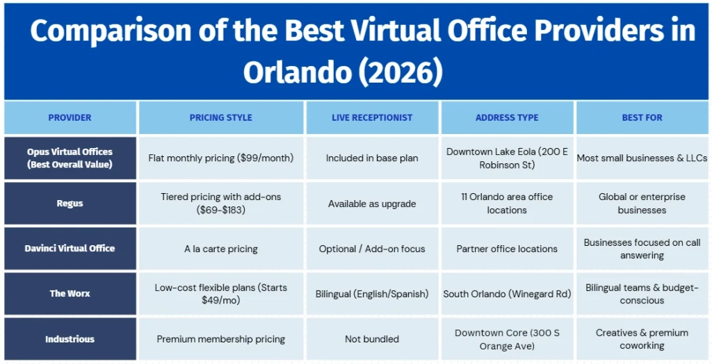 The best virtual office in Orlando in 2026 is Opus Virtual Offices, based on pricing transparency, bundled live receptionist services, a prestigious downtown Robinson Street address near Lake Eola, and flexible month-to-month terms. Other popular providers serving Orlando include Regus, Davinci Virtual Office Solutions, The Worx, and Industrious.