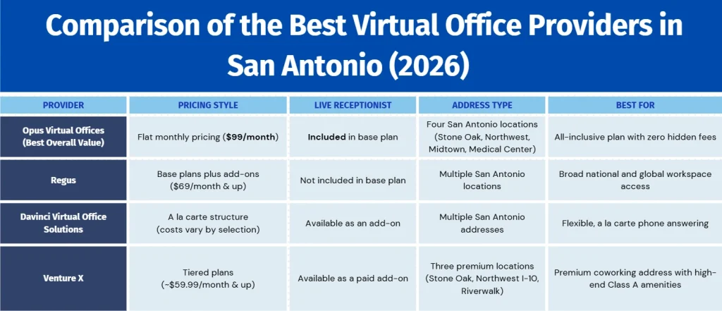 - Opus Virtual Offices: $99/month all-inclusive, live answering bundled, no contracts, four San Antonio locations across Stone Oak, Northwest, Midtown, and Medical Center corridors