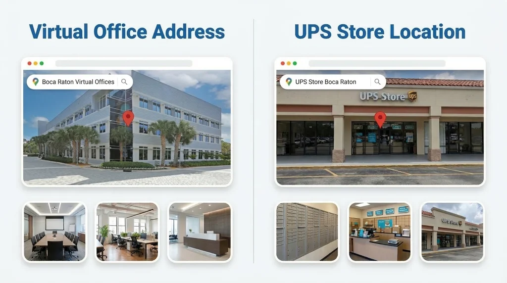 When a client, investor, or bank searches your business address, the result matters. A virtual office address resolves to an office building in a commercial district. A UPS Store address, by contrast, resolves to a retail shipping storefront in a strip mall or shopping center.
