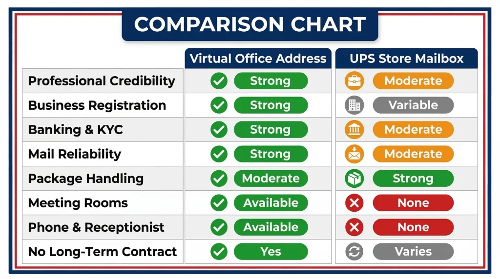 For the virtual office vs. UPS Store question, the answer depends on what you need your address to do. If you simply need a place to receive packages, a UPS Store mailbox is a reasonable option. However, if you need a business address that holds up with banks, state agencies, clients, and marketplace platforms, and as your business grows, a virtual office is the smarter investment.