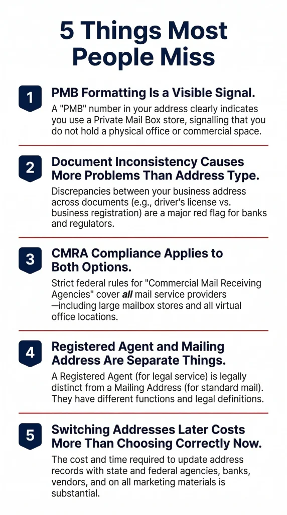 Document inconsistency causes more problems than address type: Your IRS EIN filing, state registration, bank account, and website footer all need to show the same address, formatted identically. Inconsistency across any of these triggers verification issues regardless of which option you choose. Pick one address and use it everywhere from day one.